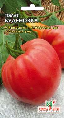 домат „Буденовка“ е висок сорт със средно време на зреене. В открита земя храст може да се простира на метър височина, а в оранжерия - един и половина метра. Първите плодове започват да узряват след 110 дни от момента на засяване на семената, докато цветът на плода може да бъде както меки розови и червени нюанси, така и смесени. Отличителна черта на домата Буденовка е, че сортът е устойчив на късен блясък, който толкова обича да влияе на доматите. Важно е да се отбележи, че доматите имат доста плътна кора, която ги предпазва от напукване.