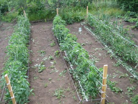 Тази процедура е не по-малко задължителна за растенията. Високите домати се нуждаят от опорни стълбове. Това може да бъде високи и стабилни колове, дървени решетки или агросетка. Вържете храстите веднага от момента на трансплантация и продължете да правите това през целия сезон, докато растат. Материалите за това трябва да са здрави, но меки, за да не се повредят части от растения, както и задължително дезинфекцирани или нови.