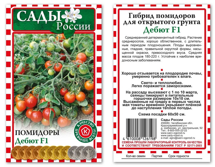 Доматът "Дебют" е вписан в държавния регистър на Руската федерация като подходящ за отглеждане в открити почви и филмови приюти. Храстите от определящия тип, обикновено не надвишават 75 сантиметра във височина, следователно, не се нуждаят от прищипване. Датите на зреене са ултра рано, можете да опитате узрели плодове вече 90-95 след сеитбата на материала. Сортът се отличава с удължено плододаване, което позволява на доматите да се приготвят дълго време. Можете да отглеждате храсти в цялата страна, предвид климата, засаждането в градината или в оранжерия.