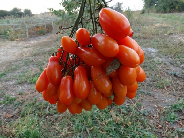 В технически стадий зрелостта е яркочервена, в биологичен етап доматите са светлозелени. Кожата е лъскава, гладка и равномерна, с малко количество семена вътре. Доматите растат на клони, образувайки големи четки. Теглото на всеки плод е около 40-65 г и дължина 6-8 см. От един храст добивът може да бъде 7 кг.