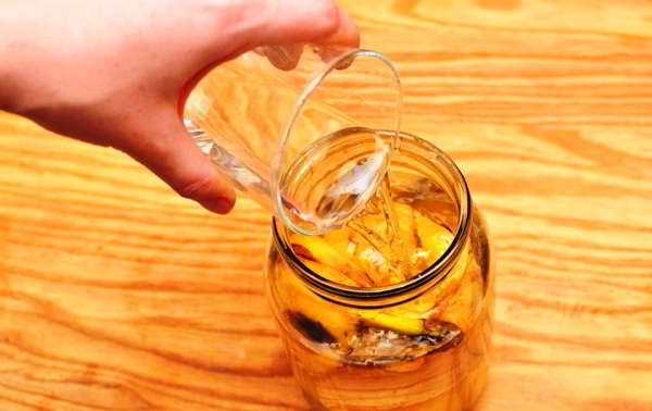 Инфузията на кожата е най-удобният и лесен начин за оплождане, който често се използва. За да приготвите инфузията, трябва да вземете 1-2 измити кожи без опашки и да ги поставите в 1,5-литров стерилизиран буркан.