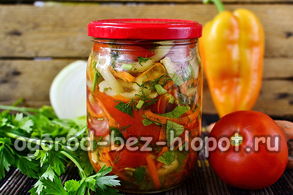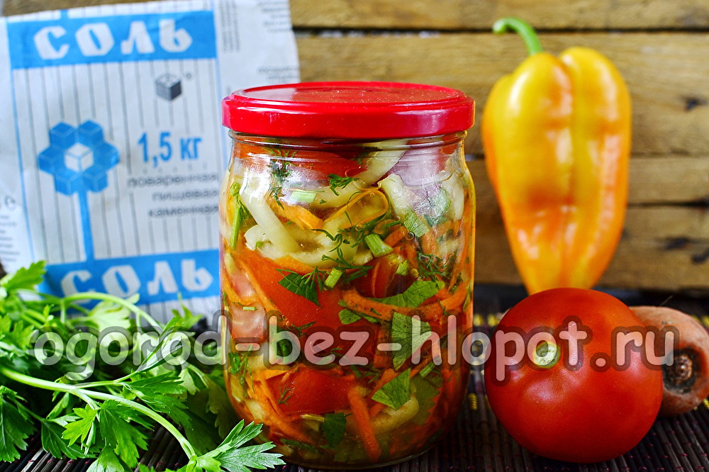 За да спестите собственото си време, можете да правите специални зеленчукови препарати. Те могат да се използват при приготвяне на салати, първи ястия, яхнии и гарнитури или просто да се ядат с месни или рибни ястия. Супа дресинг за зимата без готвене е универсална рецепта, можете да готвите такъв зеленчуков асортимент за няколко минути. Тук не е необходимо да стерилизирате или готвите, а наборът от съставки е прост и достъпен за всички. Отсъствието на трапезен оцет в състава прави детайла напълно безопасен и много полезен. Сега във вашата диета винаги ще има пресни зеленчуци, въпреки студената зима извън прозореца.