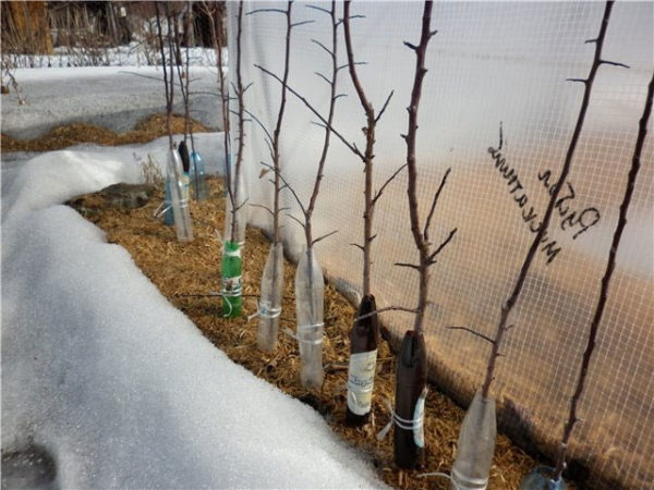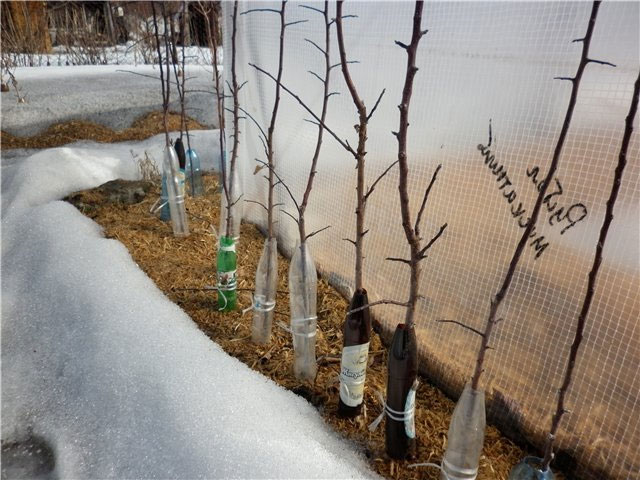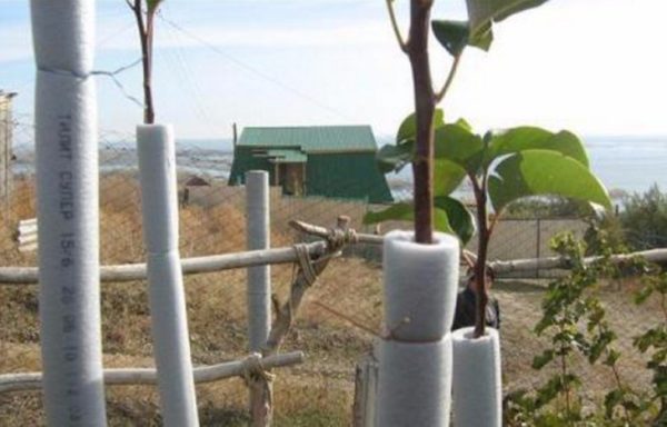 Ако разсадът вече е бил засаден, е невъзможно да ги копаете в окопа, необходимо е да се засилят защитните мерки срещу студ и вредители. Стъблото и клоните са плътно обвити със синтетичен агрофибър в няколко слоя. Освен това между тъканта и кората може да се сложи слой филц. Трябва да затворите цялата височина, всички малки клони, в противен случай те няма да могат да зимуват. Кръгът на багажника задължително е покрит със смърчови клони или слама, самото мулчиране не е достатъчно.