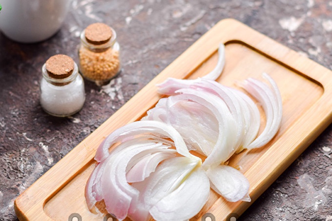 Подгответе всички продукти. Обелете лука, изплакнете и подсушете. Лукът нарязан на половин пръстени.