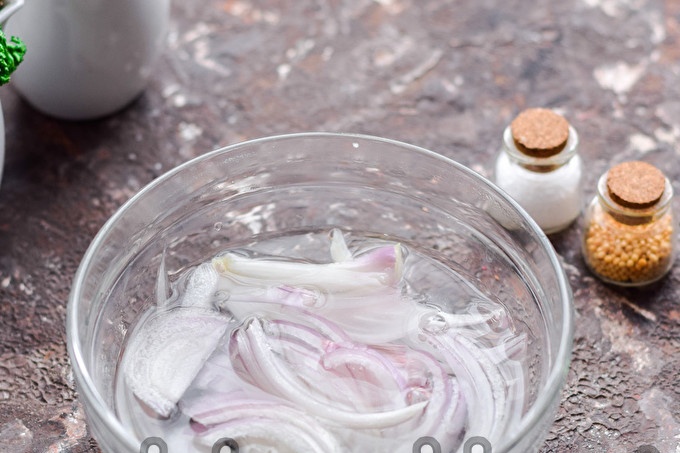 След като сгънете резените лук в купа, изсипете хладка вряща вода и оставете за 2 минути на мира. След известно време изцедете водата.