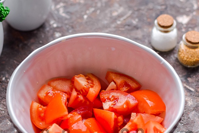 Изплакнете доматите и изсушете. Нарежете доматите на големи парчета, отстранете мястото на растеж на стъблото. Прехвърлете резени домати в дълбока купа.