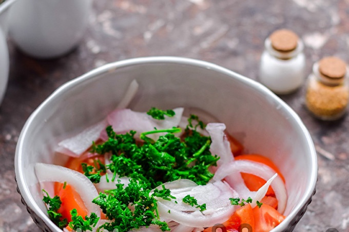 Доматите и лукът се допълват от ароматни пресни билки - тук можете да използвате всякакви билки, които харесвате.