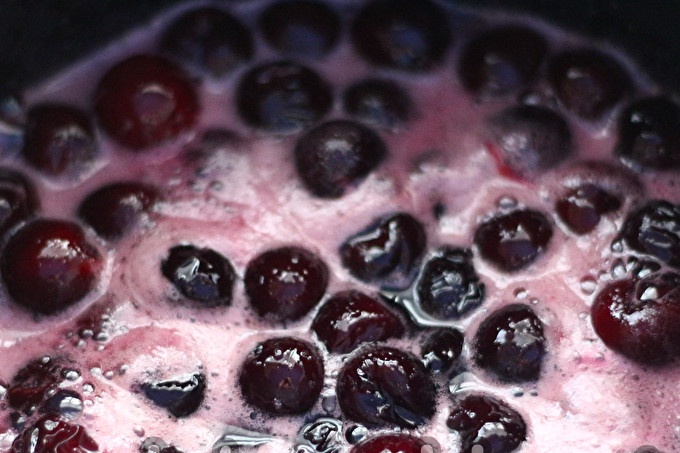 Поставете черешата и сока в термоустойчив съд с дебело дъно на печката, включете горелката на средна мощност. Когато сиропът започне да ври, намалете котлона до слаб и продължете да готвите конфитюра при постоянно умерено кипене в продължение на 5 минути.