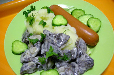 - Нарежете ситно чесъна и смесете със заквасена сметана, добавете към прасетата и оставете да къкри на слаб огън за около четвърт час.
