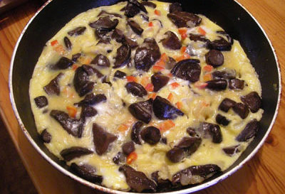 - Изсипете яйцата в тигана към гъбите и лука, покрийте и гответе на слаб огън, докато омлетът е готов.