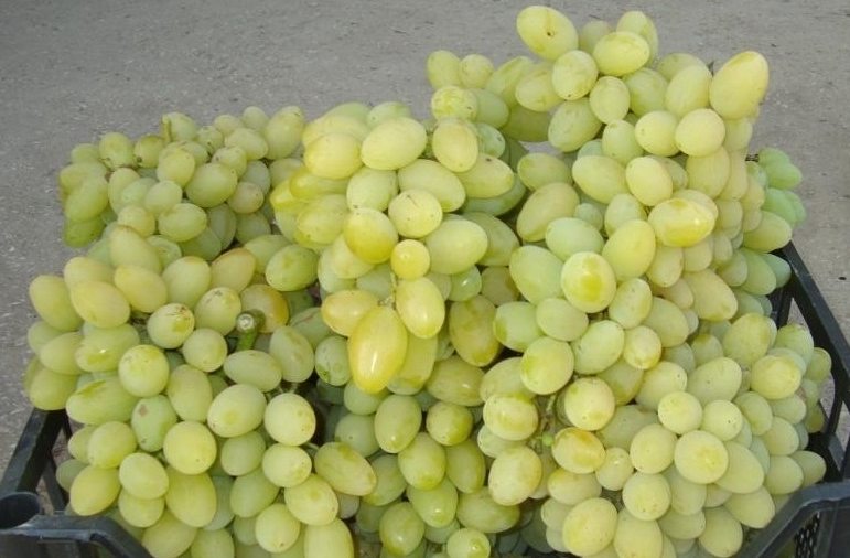 По форма плодовете наподобяват малко копие на пилешко яйце. Средно гроздето тежи около 15 г и се срещат много едри плодове с тегло до 20 г. Нежната розова кора с тънки вени е доста плътна и еластична, благодарение на нея гроздовите четки запазват представителна презентация дори след транспортиране. Понякога в пулпата могат да се натъкнат малки кости, това явление е рядко, но все пак се среща. Продуктът е предназначен изключително за консумация на суровина, но задушени плодове и вино от тази суровина също са вкусни.
