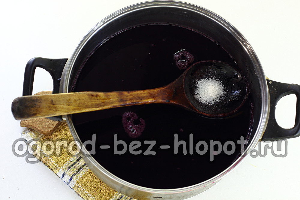 Върнете сока обратно в тигана. В този случай бяха получени 2,5 литра чист сок. Той е много концентриран. Разредете го с вода до желания вкус, изсипете захар на вкус, изпратете на огън и оставете да заври. Варете 5-8 минути.