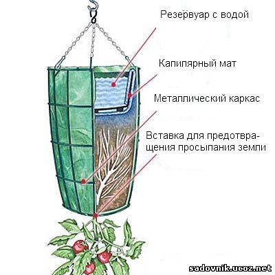 По същия начин можете да отглеждате домати, включително в оранжерия. Необходимо е да се използват удобни саксии за отглеждане, които са разположени отдолу нагоре и окачени някъде на площадката. Прочетете за правила за поливане на домати в оранжерия.