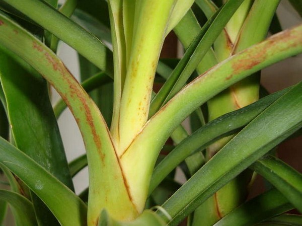 В резултат на излишната течност корените на цветното гниене. Болното цвете става летаргично, започва да хвърля листа. В този случай трябва да намалите поливането на юка, да извадите повреденото растение от почвата и да премахнете гнилите корени. След пресаждането на цветето в нова почва.