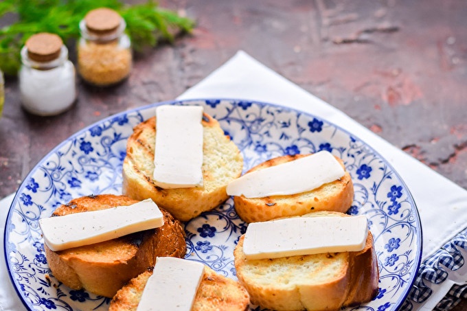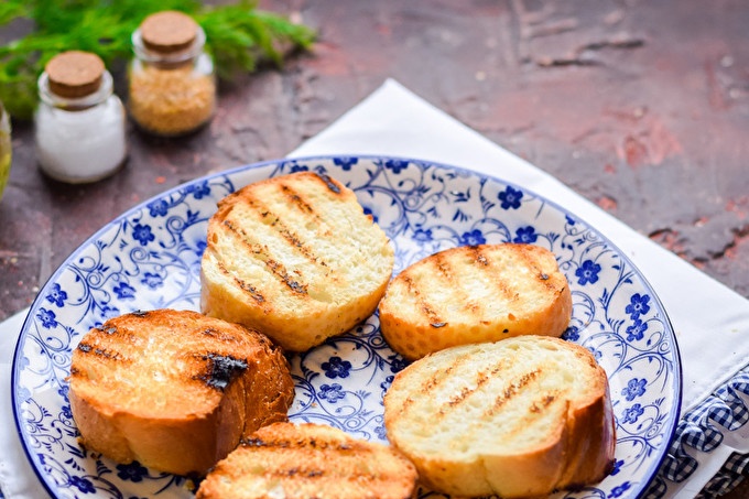 Подгответе всички необходими продукти от списъка. Нарежете франзела на малки парчета. Загрейте тенджерата на печката, след това сложете парчетата франзела в тигана, запържете от двете страни в продължение на няколко минути. Получените червени парчета багет се охлаждат леко.
