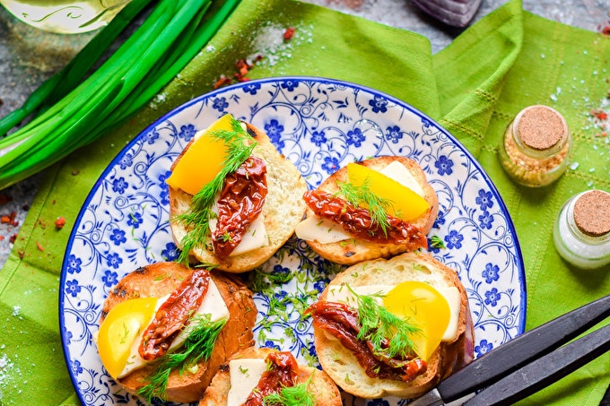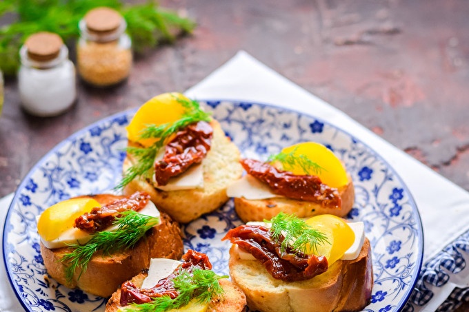 Последният акцент е да се поставят сушени домати на всяка брускетта, да се украсят с клончета от свеж аромат на копър.