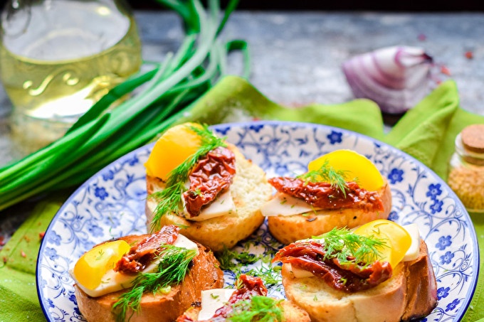 Bruschetta със сушени домати - страхотна закуска за празнична маса, която ще се хареса на абсолютно всички. С помощта на поетапна фото-рецепта лесно можете да приготвите вкусни брускетти.