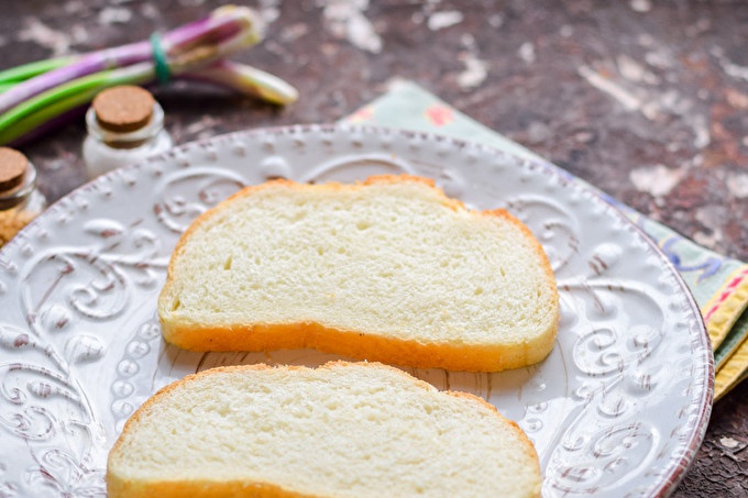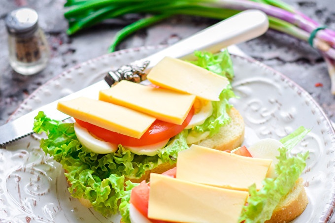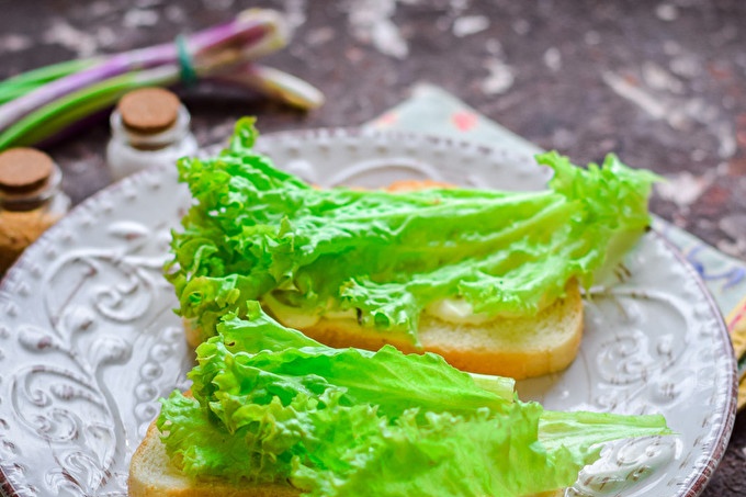 Подгответе всички продукти от списъка. Изберете чифт резени от вкусна прясна хляб. Ако е необходимо, хлябът може да бъде изсушен в тиган или във фурната.