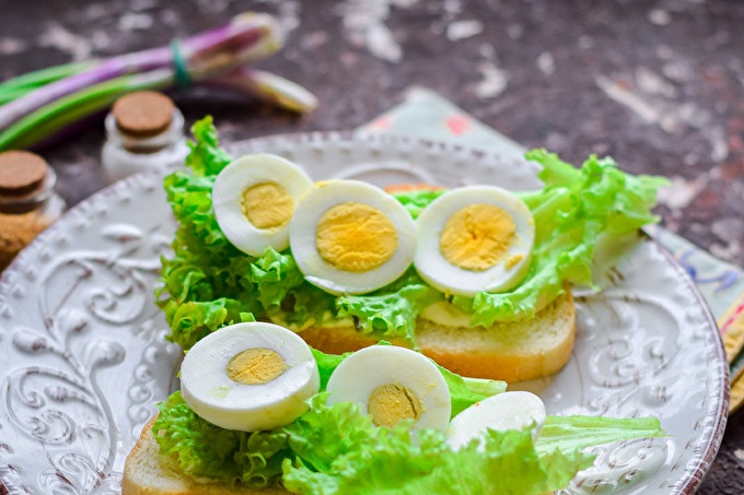 Сварете яйцата на пилето предварително - 10 минути в подсолена вода. Обелете яйцата от черупката. Нарежете яйцата на филийки и ги сложете на сандвичи.