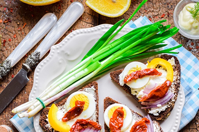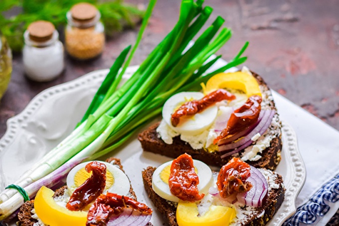 Нанесете сушени домати на сандвичи и ги сервирайте, можете също да ги украсите със зелени.