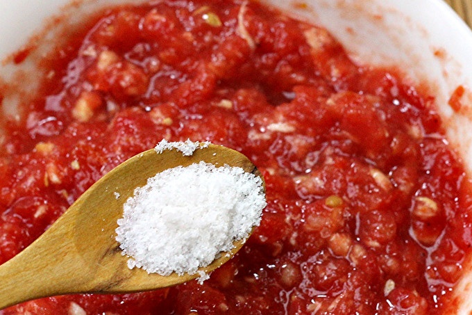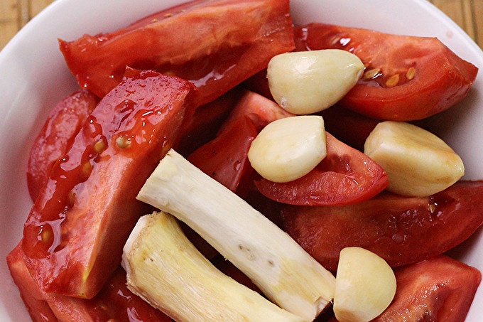 По-добре е да се вземат домати напълно узрели, месести, така че подправка не се окаже водниста. Измийте, отстранете клонките. Ако има повреда на кожата - нарязани. Кожата не трябва да се отстранява, не се усеща в готовата подправка.