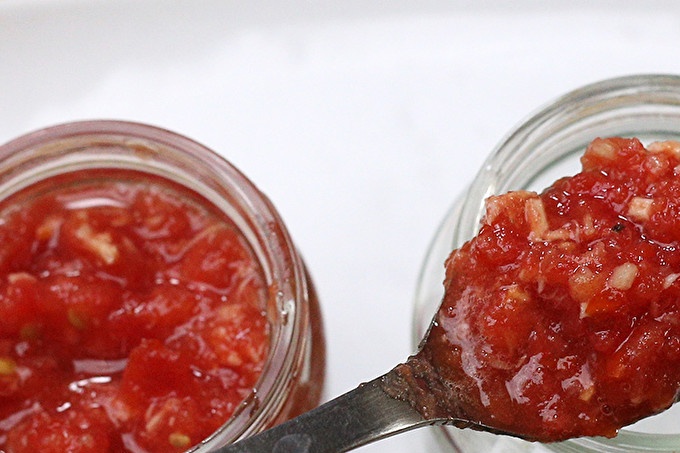 Доматите са много пикантен подправки, които могат да включват чесън, корен от хрян, люта чушка (тази възможност е за ядене на огън), сладък пипер, оцет, смлян пипер, ябълки и дори сливи.