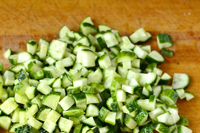 За приготвянето на такъв растителен хайвер взимаме краставици от късните сортове. Можете да вземете големи зрели плодове. Но в този случай е необходимо да проверите плодовете за горчивина, а също и да отстраните от тях грубата кожа. Нарязваме краставици на малки кубчета.