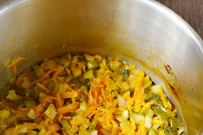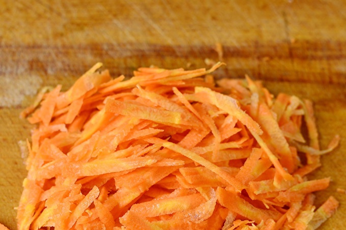 Тогава нарязани моркови и лук се изпращат в един съд, който ние поставяме на печката.
