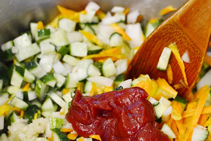 Добави сол, пет супени лъжици масло и подправки, например, смлян черен пипер. Задушете зеленчуците за 10-15 минути. Сега поставяме в пота основния компонент - краставиците. Сварете 15 минути и добавете доматено пюре, нарязани скилидки чесън.