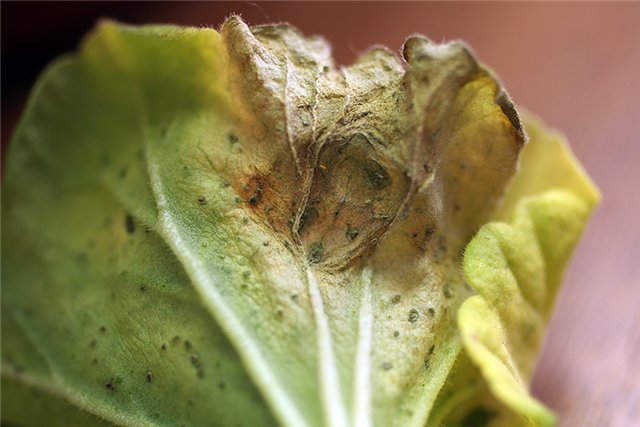 Освен хлороза, която се развива от липсата на хранителни вещества, пеларгонията страда от коренна гниене и ръжда. Последното заболяване е най-опасно. Първите признаци са малки жълти петна по листата. Няколко дни по-късно те пресъхват, придобивайки кафяв оттенък и пукнатини.