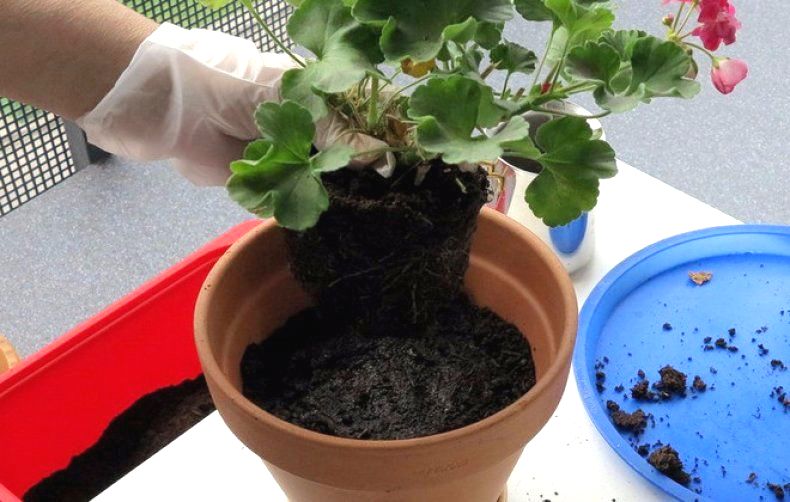 Растението внимателно се отстранява от контейнера, освобождавайки кореновата система от почвените частици и инспектира. Всички корени с признаци на гниене отрязани, вземете парче здрава тъкан. Подземната част на пеларгония се промива и третира с фунгицидни средства. След изсушаване на корените, цветето се трансплантира в прясна почвена смес. Така че в бъдеще няма да има такива проблеми, растението се полива само след като повърхностният слой на почвата изсъхне, като се избягват преливания.
