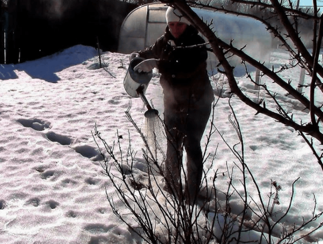 Горещата вода може да причини изгаряне на растенията. Строго забранено е да се извършва процедурата по време на активния вегетационен период, когато пъпките вече цъфтят. Начинаещите градинари трябва да помнят, че потокът от сок в касиса започва много рано. Точният момент на поливане е труден за повикване, обикновено е март. Най-добрата временна насока ще бъде началото на активното топене на снега, което в някои случаи все още е в градината, а височината на покритието е 5-10 см.