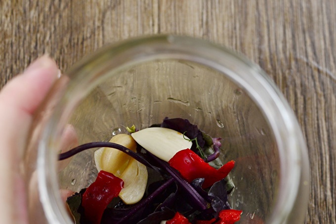 Измийте под гъста вода с хладни, без дефекти домати, люти чушки, босилек. По това време поставяме вода на печката, така че да кипи. Сушете доматите с хартиена кърпа. Зеленчуците трябва да бъдат сухи. Почистете и режим на няколко парчета чесън.