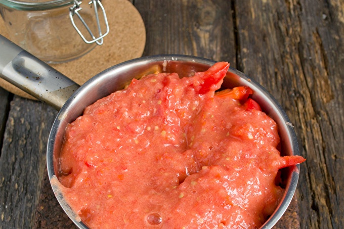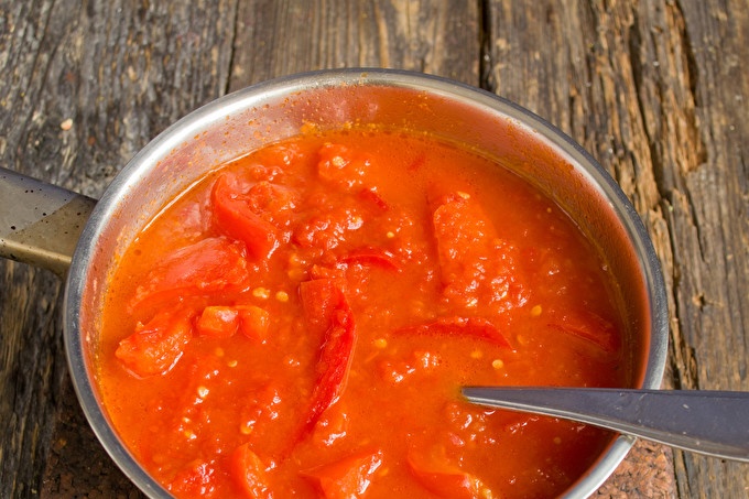 След това добавете настърганите домати, поръсете солта без добавки и гранулирана захар. Постави леко на печката, заври.