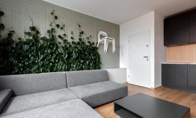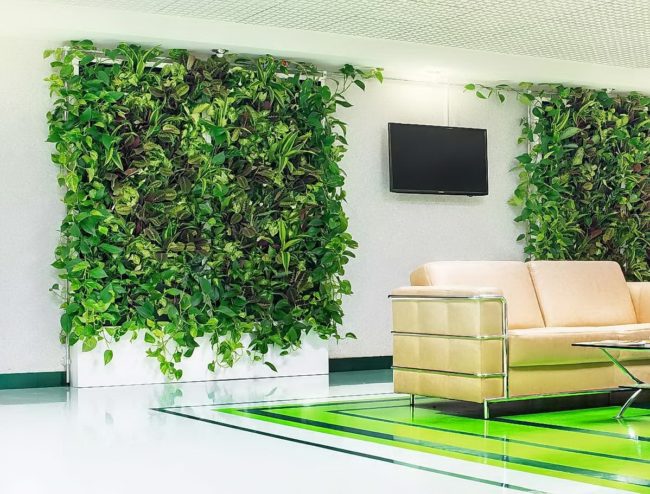 Общ метод за вътрешна декорация е вертикалното озеленяване. Благодарение на растенията, прохладата на стената е запазена, нивото на шума е намалено, ярката светлина на слънцето е разсеяна и въздухът се пречиства.