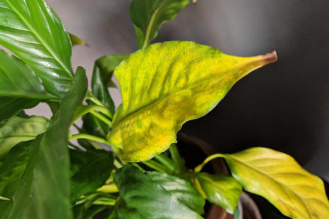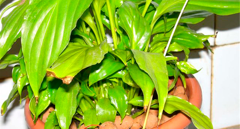 Сушенето и пожълтяването на листата се наблюдава при неправилно въвеждане на храната. Освен това, Spathiphyllum ще реагира по подобен начин както на дефицита на минерални вещества, така и на техния излишък.