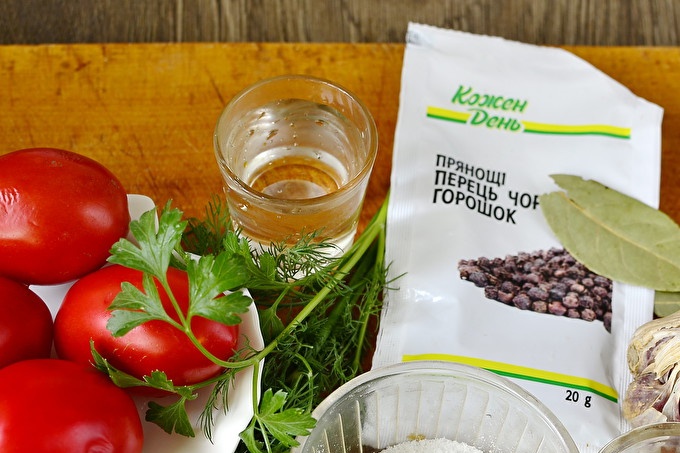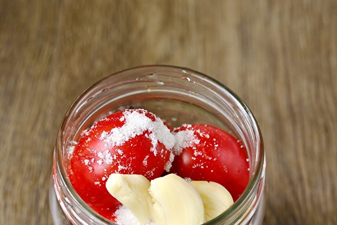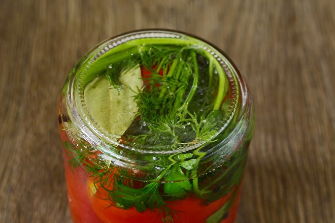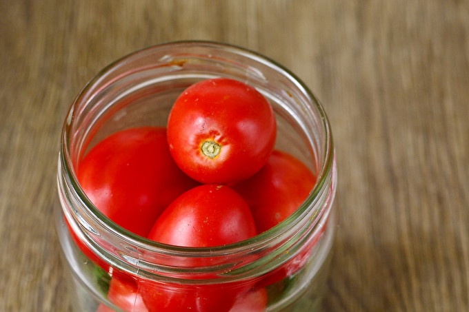 Доматите са избрани зрели, месести, без увреждания и с гнило място. Основното в тази рецепта е, че доматите са с приблизително еднакъв размер и един сорт. Стерилизирайте стъклените съдове по всякакъв начин, удобен за вас (над пара / фурна / микровълнова печка), сварете специални капаци във вряща вода за няколко минути. Изсушаваме тарата и поставяме в нея любимите си зелени и сушени листа.