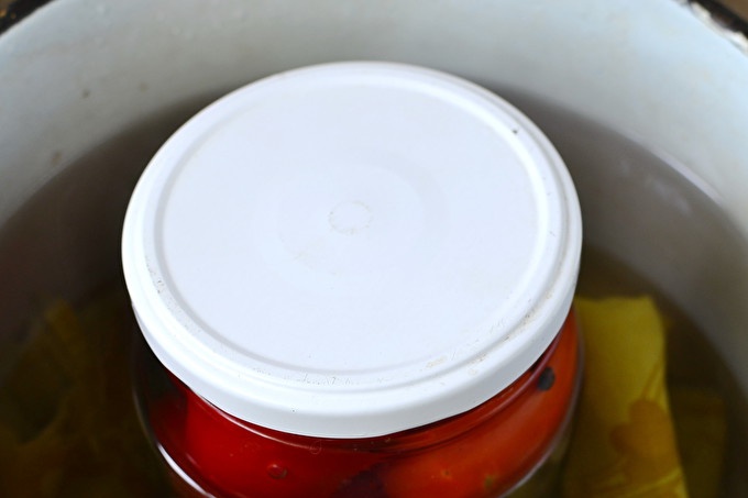 За трети път напълваме кутийките с вряща вода и ги изпращаме за стерилизация в контейнер с покрито дъно в продължение на 20 минути.