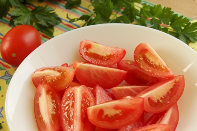 Измийте доматите със студена течаща вода. Нарежете доматите на 2 или 4 части. Основното нещо е, че резените от домати трябва да са приблизително еднакви, а след това се мариноват равномерно. Най-добре е да се използват „кремообразни“ домати, да се нарязват на половина по дължина - най-малко вероятно е да загубят формата си по време на стерилизацията. Ако е необходимо, внимателно изрежете точките на закрепване на дръжките.