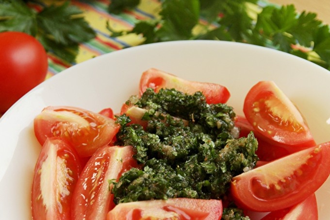Зелените могат да се използват не всички, а да избирате от тези, които ви харесват, но това не трябва да бъде само един вид зеленина. Доматите за тази рецепта са подбрани малки, червени, но много плътни, иначе след стерилизация те ще се превърнат в бъркотия. Вместо горещи люти чушки може да се използва чили пипер (1/4 от средно голяма шушулка).