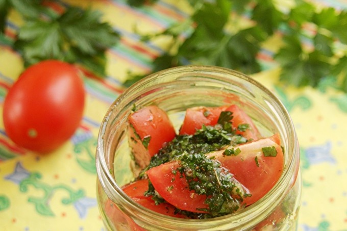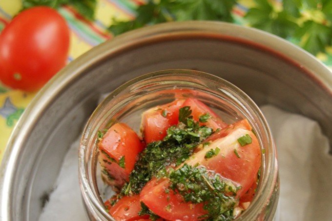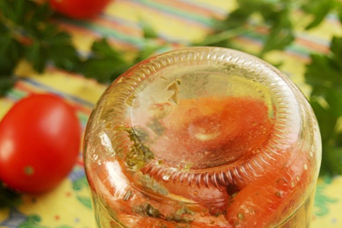 След стерилизация, доматите ще се утаят малко, бурканчето ще изглежда непълно. Но се откроява много сок, в който доматите ще маринират. Запазете такава консервация трябва да бъде на тъмно място, а не непременно на хладно, но не и горещо.