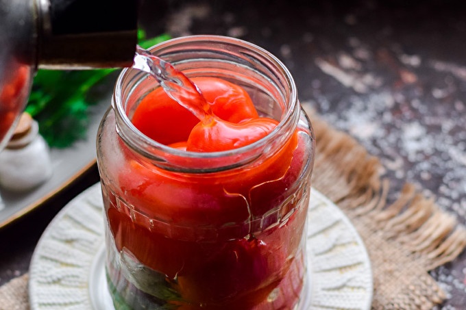 Изсипете марината в буркан с домати.