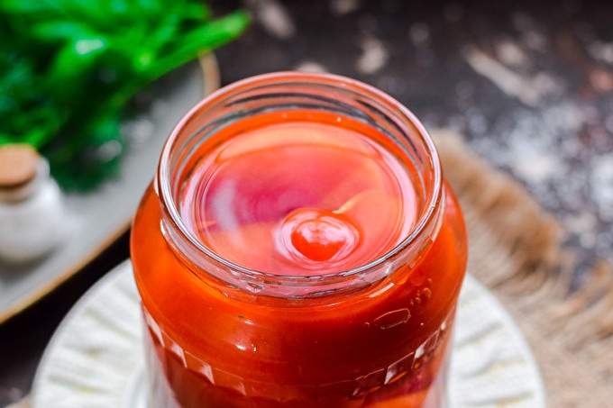Ако харесвате пикантни закуски, можете да добавите малко чили пипер - буквално няколко тънки къдрици. Доматите се сервират на всякакви ястия, месо, птици, зърнени храни и др. Стъпка по стъпка рецепта с снимка, ще ви помогне да разберете процеса на готвене и да подготви вкусна подготовка за зимата на домати.