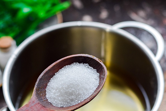 Третият път изцедете водата в тенджера, добавете сол и захар, сварете, налейте оцет.