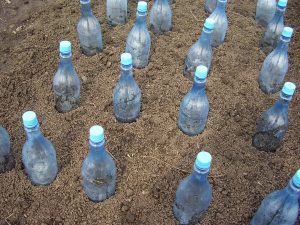 Ако вашият регион не е много южен, тогава се практикува двойно подслон. Първоначално мястото е покрито със стъклен буркан, а отгоре на отрязана пластмасова бутилка с капацитет 5 литра. Този дизайн ще ви позволи да се затопли добре в деня за печене и бавно да губят топлина през нощта, а връщането на студове не е ужасно.