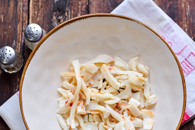 Подгответе всички компоненти от списъка. Изберете вкусни мариновани калмари, изцедете маслото, изрежете самите калмари на малки парченца. Сгънете калмарите в купа.