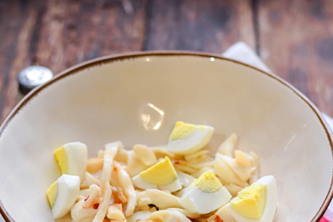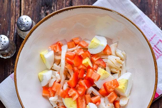 Сварете твърдо сварено яйце в навечерието, почистете го от черупката, нарязани на малки парченца и добавете към калмарите.