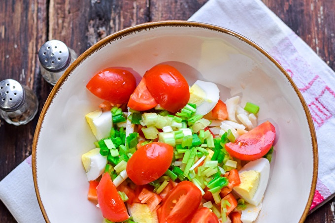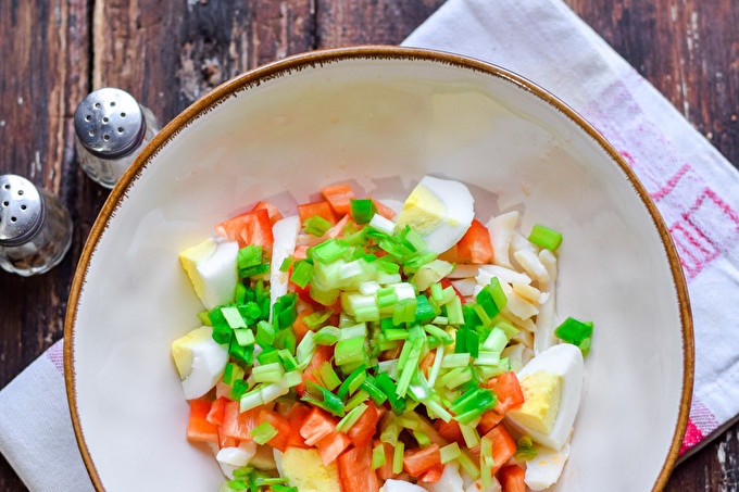 Рушат пресни зелен лук, хвърлят една добра шепа в салата.