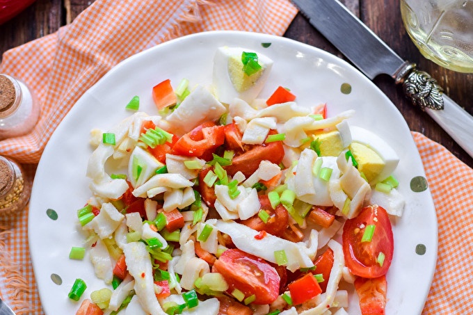 Салата от калмари с чушки и домати, вкусна и сочна!