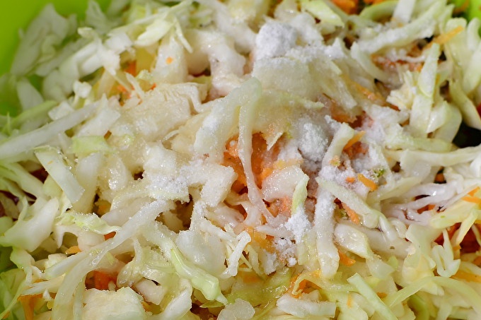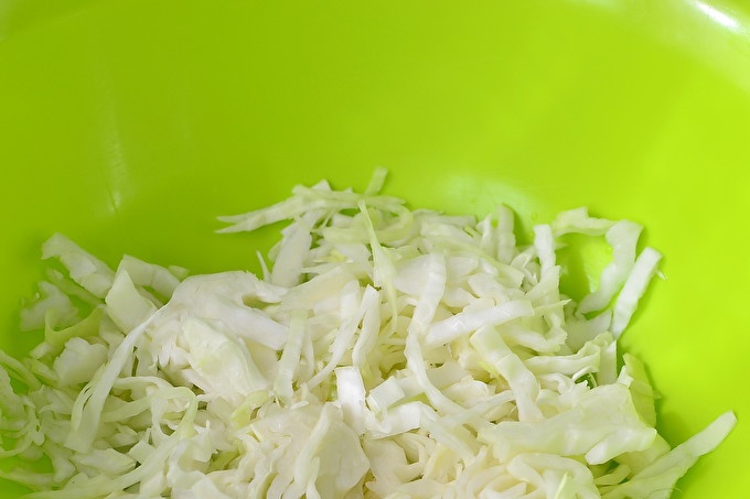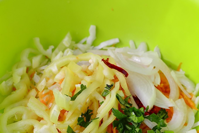 Приготвянето на зеленчуци е най-дългата част от целия препарат. Ние измиваме всички плодове, почистваме от отпадъци и след това ги нарязваме. Назъбени сламени слама от зеле. За тази цел можете да използвате специален зеленчуков нож.